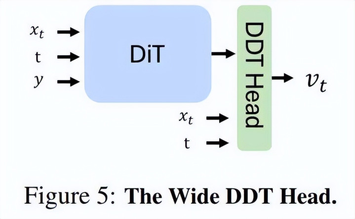 为了解决这一问题,研究者借鉴了 DDT 的设计思想,引入了 DDT head,一个浅层但宽度较大的 Transformer 模块,专门用于去噪任务。通过将该模块附加到标准的 DiT 上,模型能够在不显著增加计算量的情况下有效提升网络宽度。