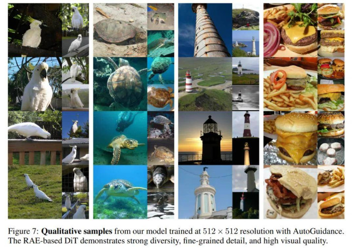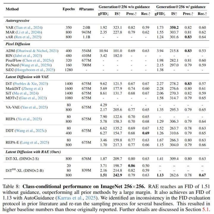 这一设计在高维 RAE 潜空间中进一步提升了 DiT 的训练效果,在 ImageNet 数据集上取得了优异的图像生成效果:在 256×256 分辨率下,无引导条件下的 FID 为 1.51;在 256×256 和 512×512 分辨率下,有引导条件下的 FID 均为 1.13。