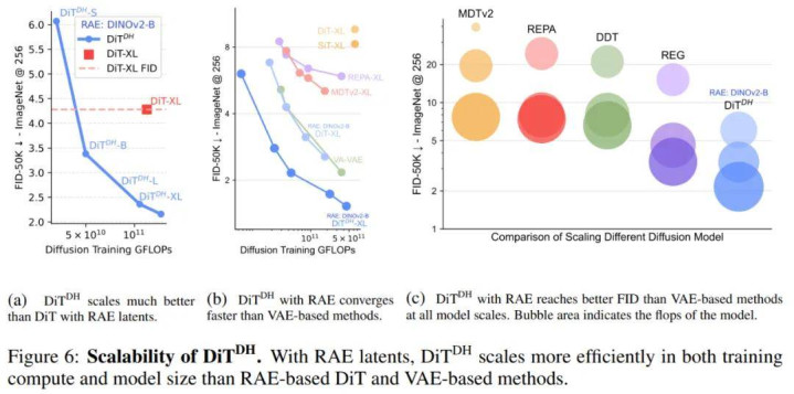 扩展性(Scaling)。研究者将 DiT^DH 与近年来不同规模的扩散模型进行了比较。结果如图 6c 所示: