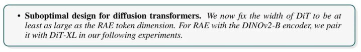为排除这种性能提升仅是模型总容量增加的结果,对照实验将宽度固定为较小值 (d=384) 并将深度加倍。结果显示,模型性能并未改善,图像依然充满瑕疵,且损失无法收敛。这表明,要使 DiT 在 RAE 的潜空间中成功生成,其模型宽度必须匹配或超过 RAE 的 Token 维度。