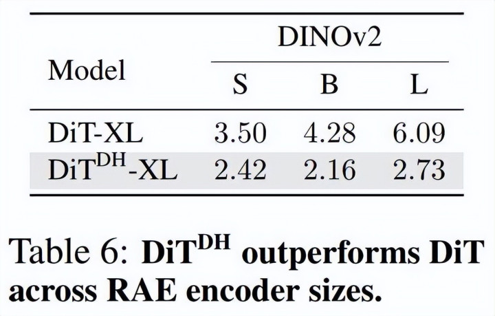 此外,DiT^DH 在不同规模的 RAE 上依然保持性能优势。