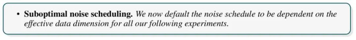 先前研究已证实,扩散模型训练中的最优噪声调度与输入数据的空间分辨率相关。本文将此概念从空间分辨率推广至有效数据维度,即 Token 数量与 Token 维度的乘积。其核心在于,高斯噪声会同等地作用于所有维度,因此 RAE 潜变量的高维度(与传统 VAE 或像素的低通道数不同)在相同的噪声水平下能保留更多信息,从而需要调整噪声注入的策略。
