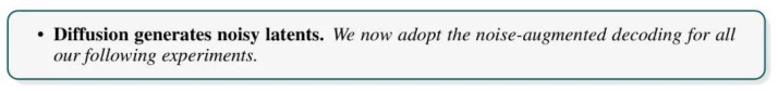 为缓解这一问题,研究者提出了噪声增强解码方案。该方法在训练解码器时,向原始的干净潜变量 z 中注入了加性高斯噪声 n∼N (0,σ2I)。此过程通过平滑潜在分布,增强了解码器对扩散模型产生的更密集、更连续的输出空间的泛化能力。为进一步正则化训练并提升鲁棒性,噪声的标准差 σ 也被随机化。