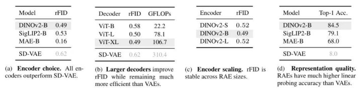接下来,研究了编码器和解码器的扩展性行为。如表 1c 所示,在 DINOv2-S、B 和 L 三种尺寸下,重建质量保持稳定,这表明即使是小型的表征编码器模型也保留了足够的底层细节以供解码。在解码器方面(表 1b),增加其容量能够持续提升 rFID:从 ViT-B 的 0.58 提升到 ViT-XL 的 0.49。重要的是,ViT-B 的性能已经超过 SD-VAE,而其 GFLOPs 效率要高出 14 倍;ViT-XL 则以仅为 SD-VAE 三分之一的计算成本进一步提升了质量。