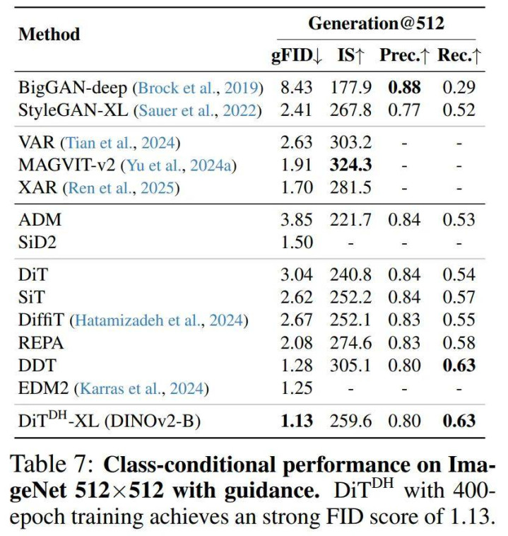 进一步扩展到 DiT^DH-XL 后,性能继续提升,在仅 80 个训练周期(epochs)下取得了 2.16 的 FID,创下了新的 SOTA 纪录。