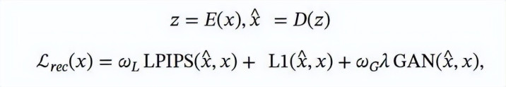 最后,在训练解码器 D 时,遵循了 VAE 的常见做法,采用了 L1 损失、LPIPS 损失和对抗性损失相结合的优化目标: