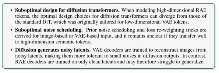 由于这些潜空间通常是高维的,一个关键的挑战在于如何让 DiT 能够在其中高效地运行。从原理上来说,将 DiT 适配到这些高维语义潜空间是可行的,但需要经过精心的设计。最初的 DiT 是为紧凑的 SD-VAE 潜空间而设计的,当面对高维潜空间时会遇到多方面的困难,包括 Transformer 结构问题、噪声调度问题、解码器鲁棒性问题。