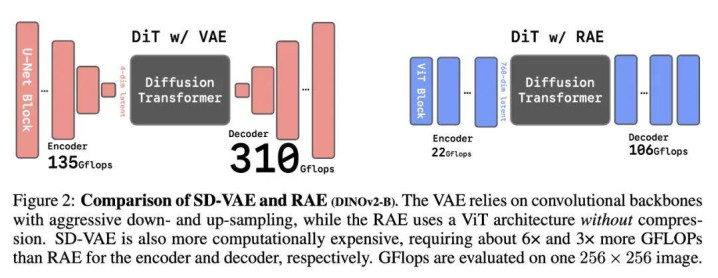 过时的骨干网络使架构比实际需要的更复杂:SD-VAE 的计算量约为 450 GFLOPs,而一个简单的 ViT-B 编码器只需要大约 22 GFLOPs。