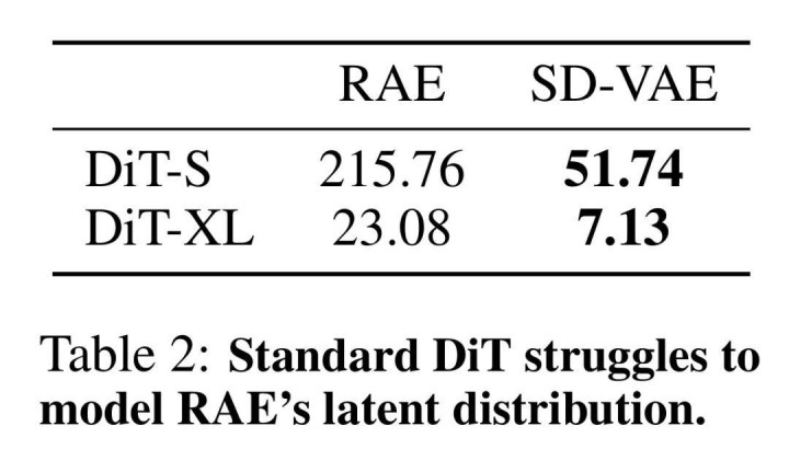 然而,出乎意料的是,标准的扩散模型训练方法在 RAE 潜空间中完全失效(见表 2)。
